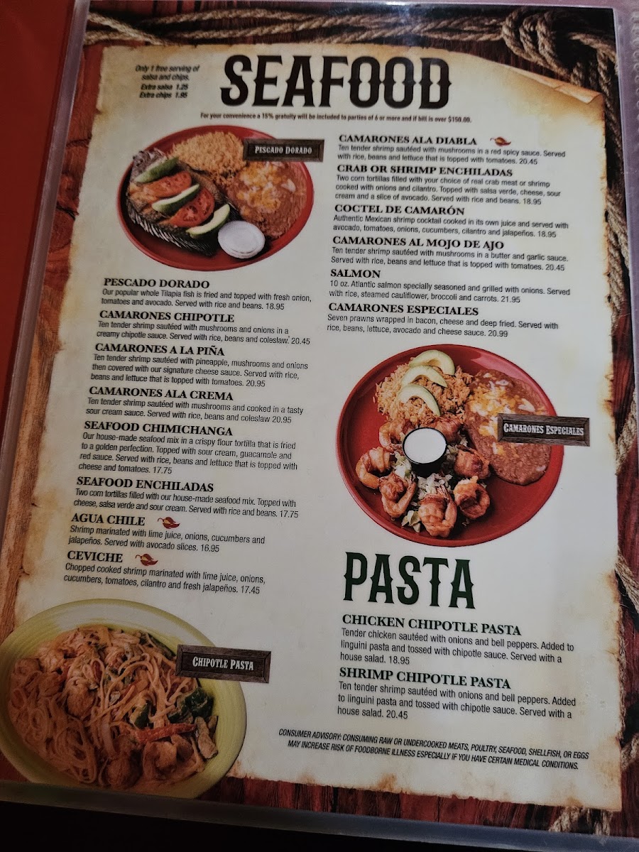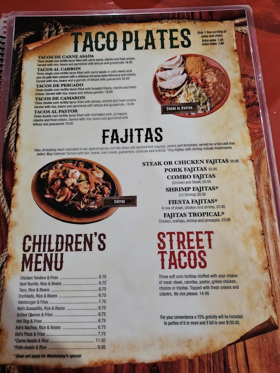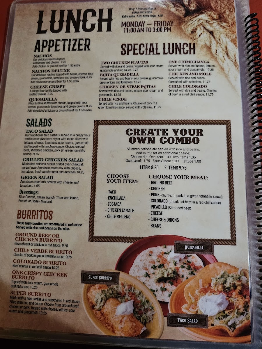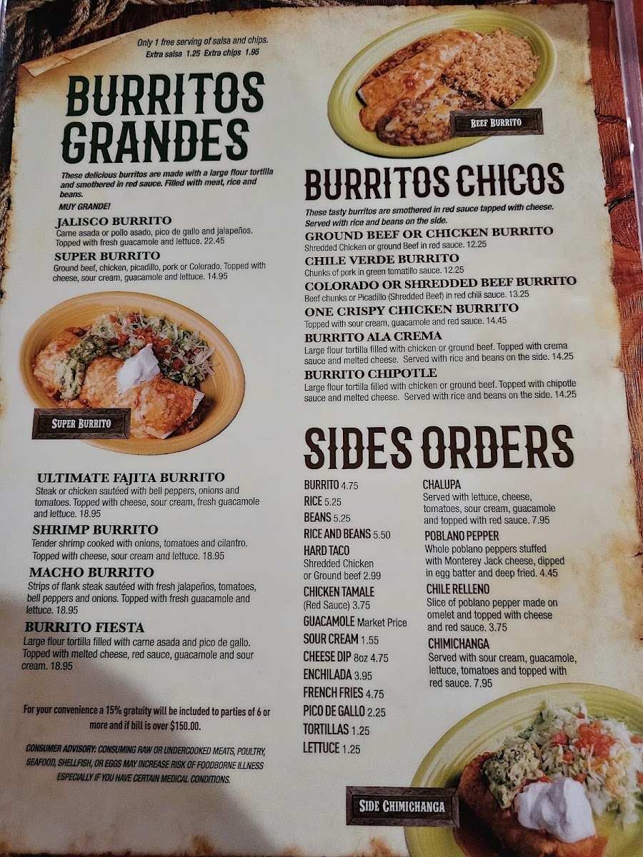Portion sizes are generally generous, suitable for lunch or dinner, and the menu serves as a complete dining option whether for a casual meal or a larger gathering. Complimentary chips and salsa are provided as a starter. Desserts such as Deep-Fried Ice Cream offer a sweet conclusion to the meal.