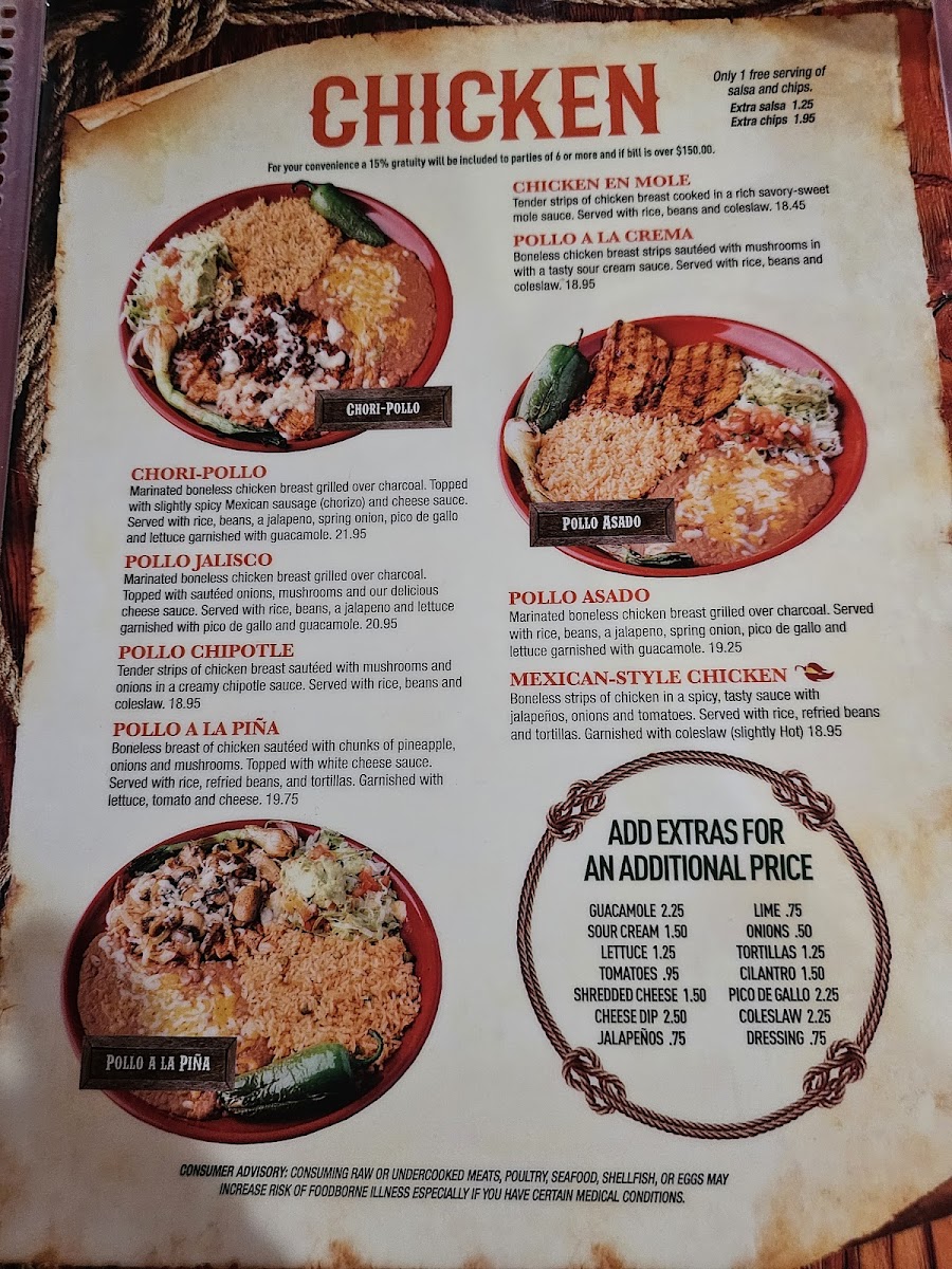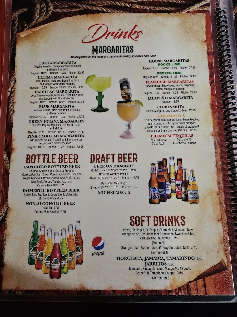 The menu features a variety of traditional Mexican dishes and beverages, designed to cater to family dining and casual bar settings. It includes well-known Mexican entrees such as Carne Asada, Pollo Asado, Chiles Poblanos, Quesadillas, and the Molcajete. There are also specialty items like Mexican Pizza, Tortilla Soup, and the Fiesta Platter for those seeking a diverse selection in one meal.